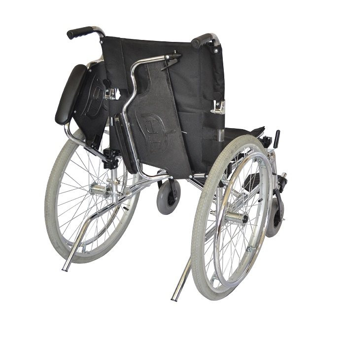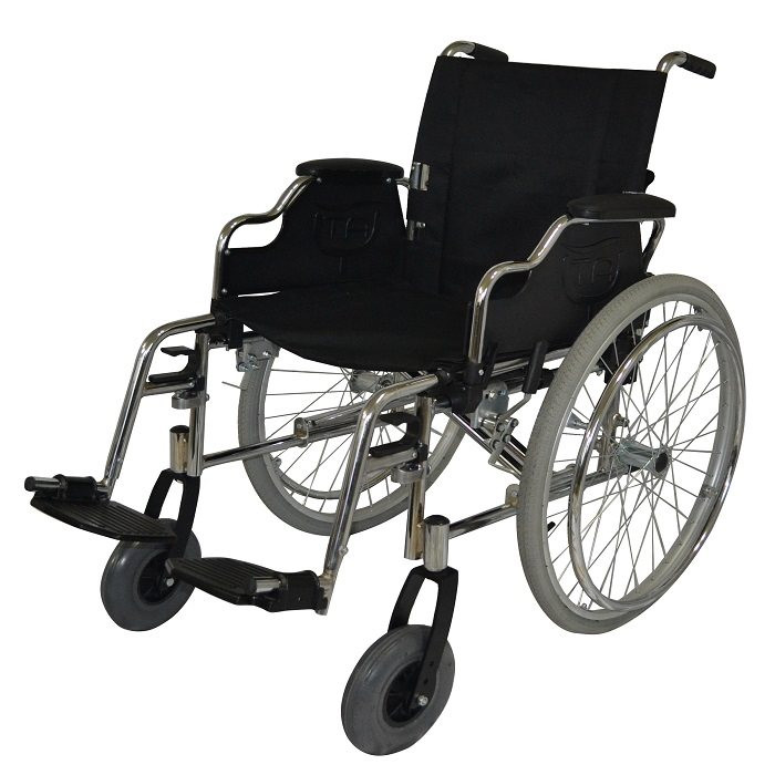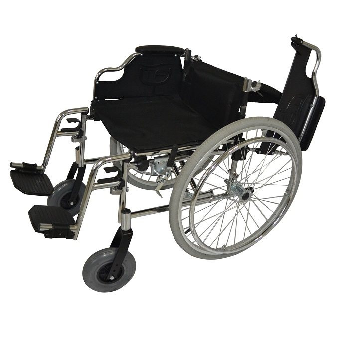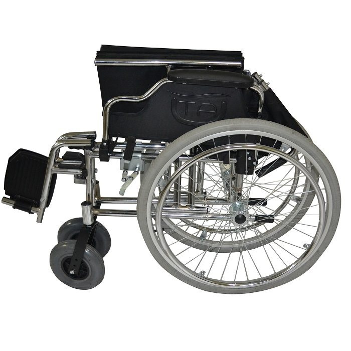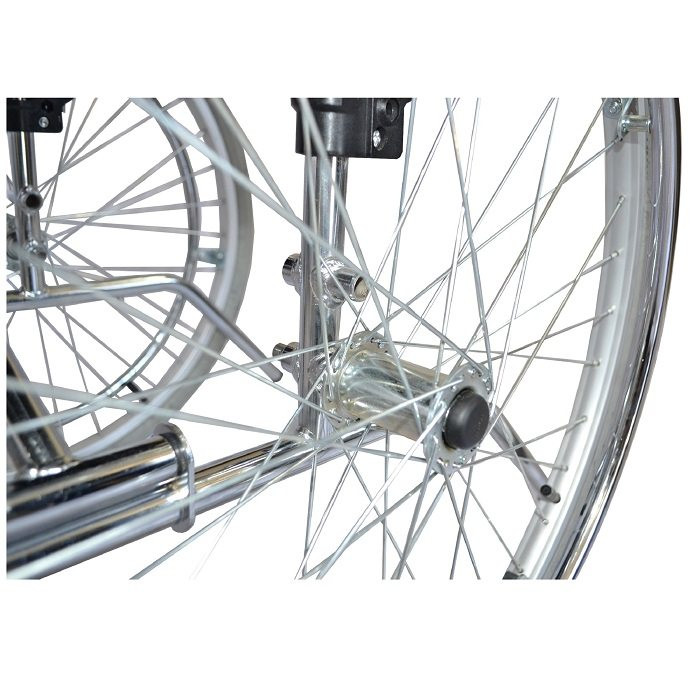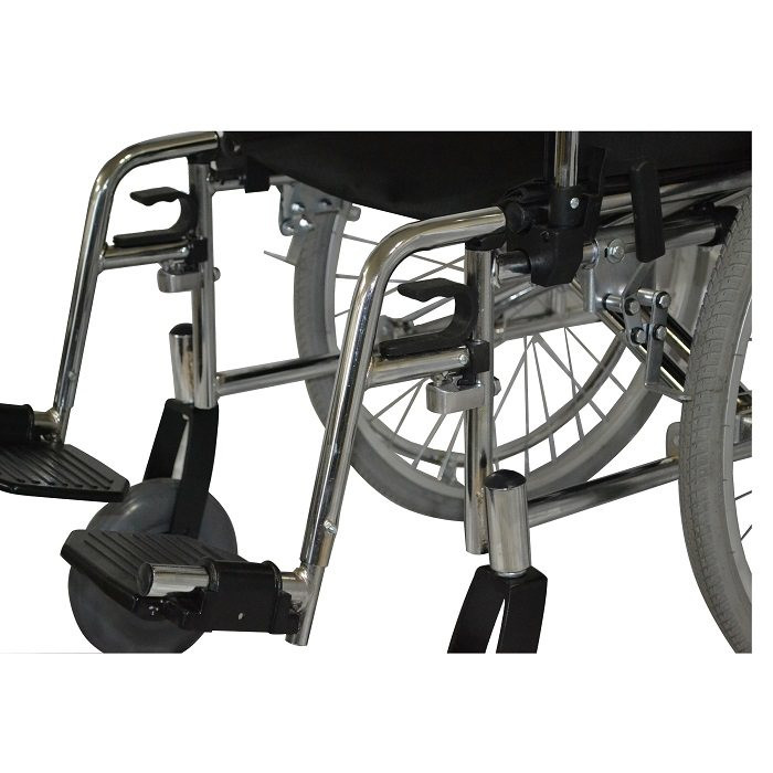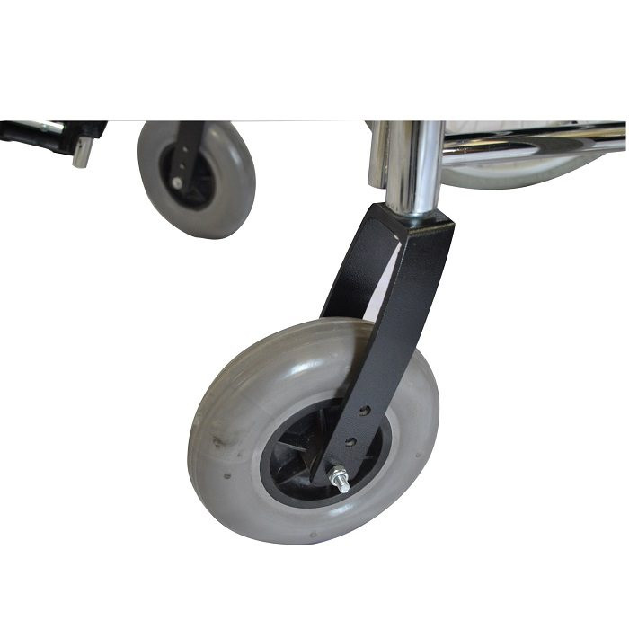 چرخ عقب ویلچر با لاستیک بادی 24 اینچ و هندریم روکش آبکاری کروم با قابلیت تنظیم ارتفاع و چرخ جلوی ویلچر، 8 اینچ 50x200 تو پر با قابلیت تنظیم ارتفاع طراحی شده است.