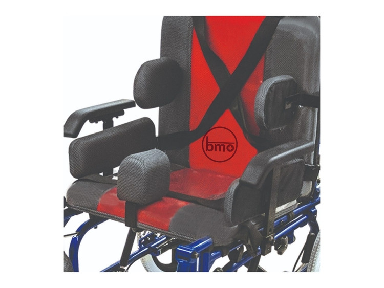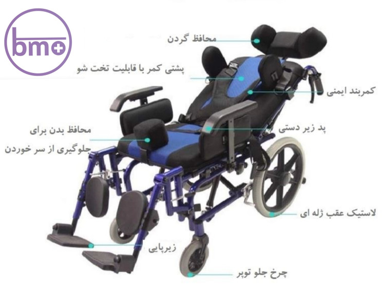 دارای پدها نگهدارنده سر ، گردن ، پهلو ، کنار ران ، بین پا و پشت ساق پا دارای جک های گازی ضامن دار برای استقرار در زاویه های دلخواه دارای جلیقه محافظ و کمربند ایمنی قابلیت حالت برانکاردی شدن ویلچر