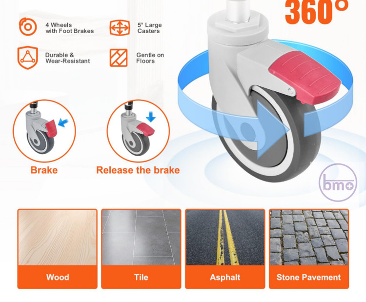 چرخ های جلو به وسیله ی پین های گیره ای که به بدنه وصل شده، میتوان ارتفاع آن را در ۵ مرحله تنظیم و ثابت نگه داشت.