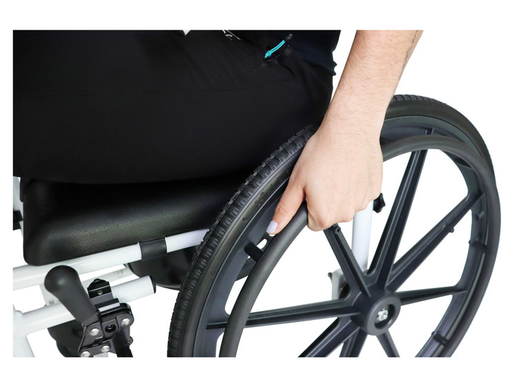 این ویلچر دارای فریم آلومینیومی سفید آنودایز و 2 چرخ 5 اینچی قابل قفل شدن در جلو و 2 چرخ 24 اینچی (چرخ ویلچر) در عقب است که امکان حرکت خود را فراهم می کند.
