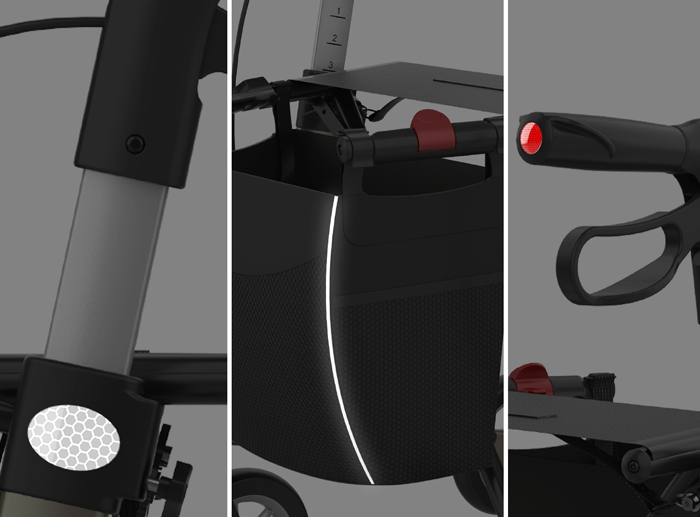 رولاتور کلاسیک حیاتی دارای بازتابنده های یکپارچه در طرفین، در درزهای جیب و روی دسته ها است. اینها دید خوب را در تاریکی تضمین می کنند و ایمنی شما را در هنگام راه رفتن افزایش می دهند.