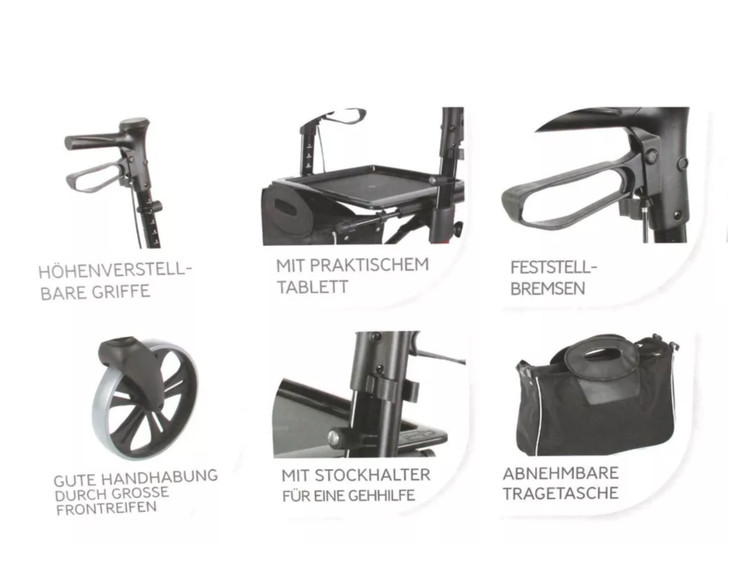 عملکردهای اضافی مانند منحرف کننده های لبه و کمک های پله ای زندگی روزمره را دلپذیرتر می کند. تاشو طولی با صرفه جویی در فضا به شما امکان می دهد به راحتی رولاتور خود را حمل و نگهداری کنید. علاوه بر فریم آلومینیومی با کیفیت و پایدار، چرخهای ضد سوراخ و روکش TPE سواری راحت را تضمین میکنند.