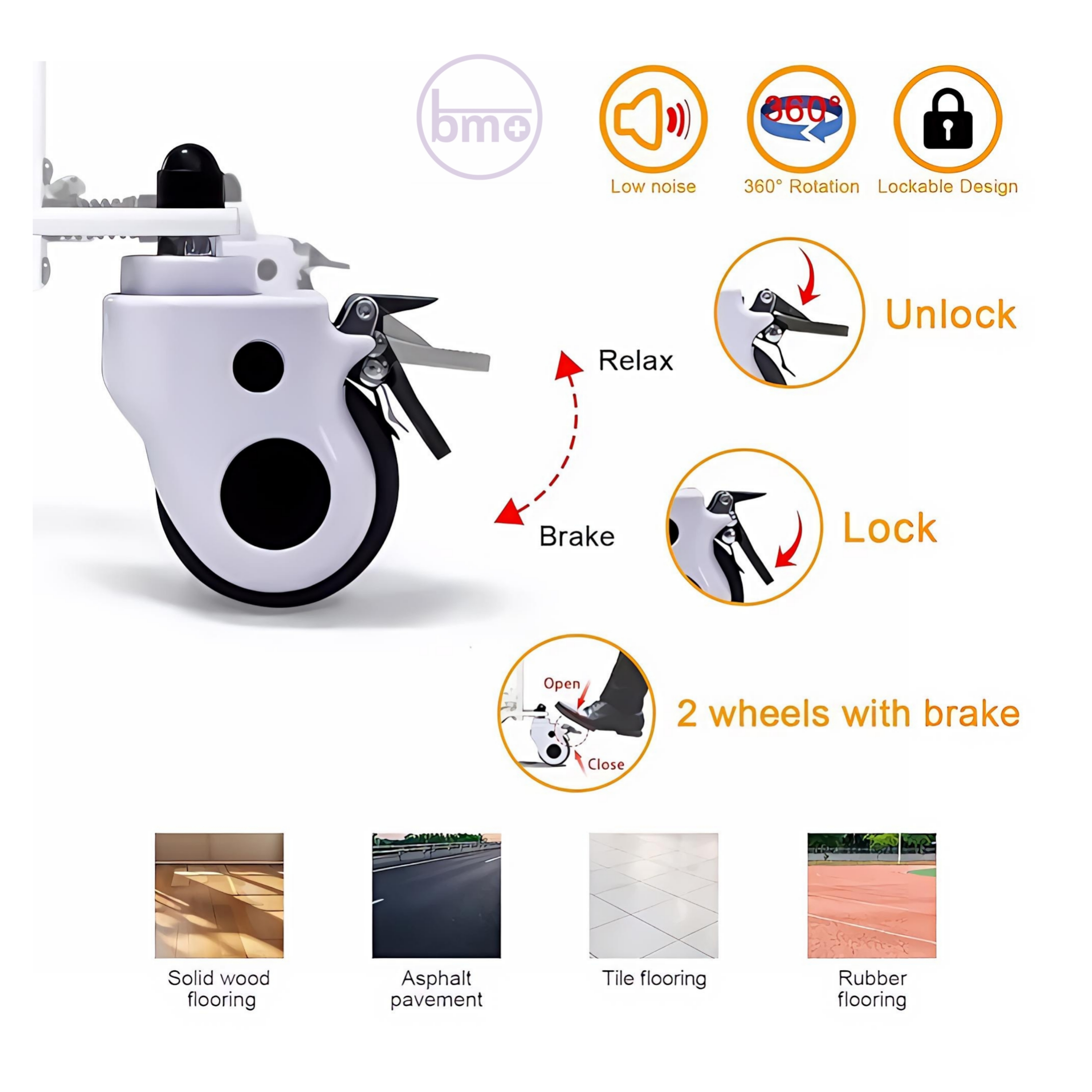 چهار چرخ روان و بیصدا با ترمز ایمنی دوگانه.