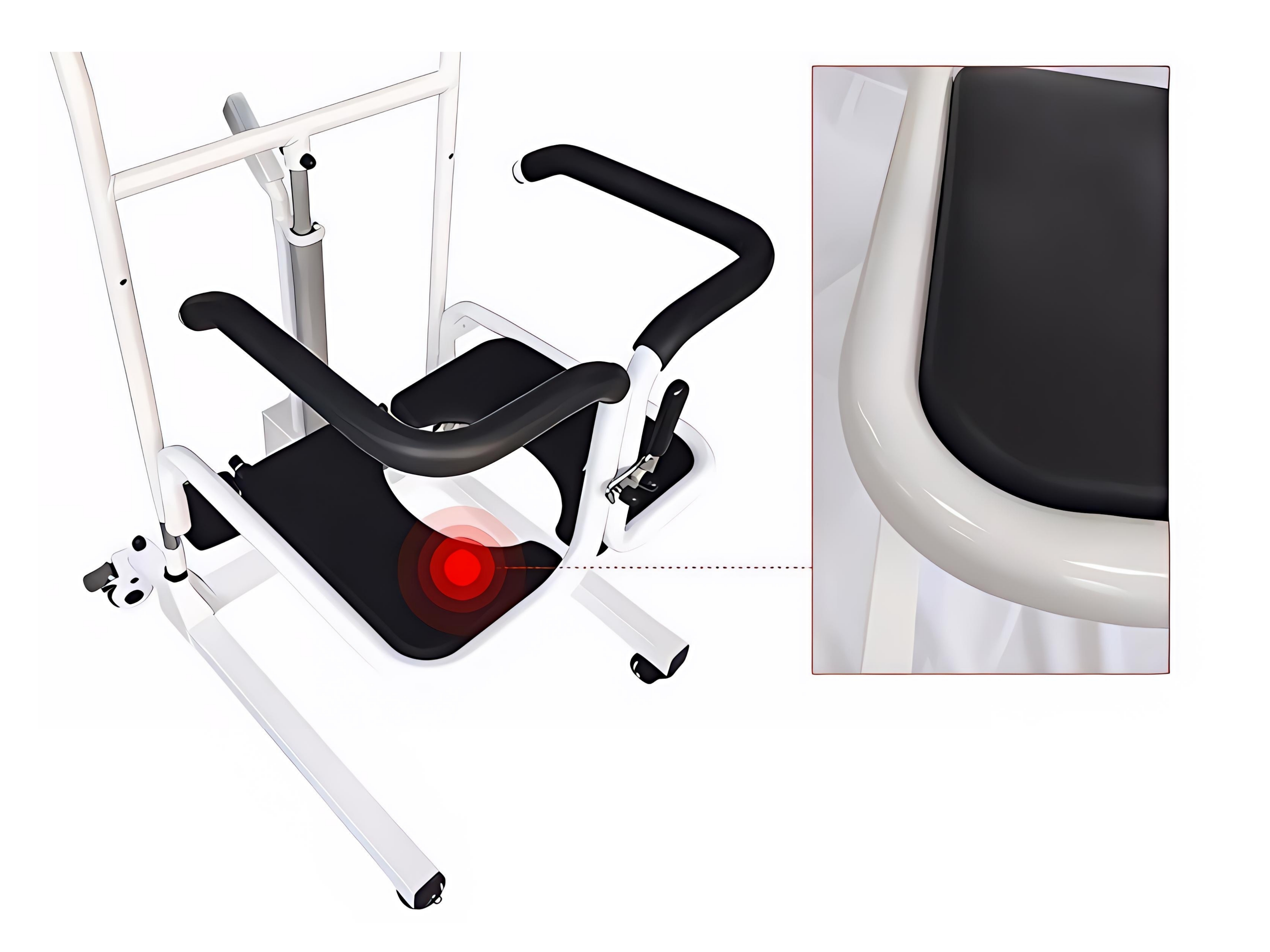 نشیمن صندلی دارای شیار تخلیه است، بنابراین بیمار بدون نیاز به جابجایی اضافی میتواند از سرویس بهداشتی یا حمام استفاده کند.