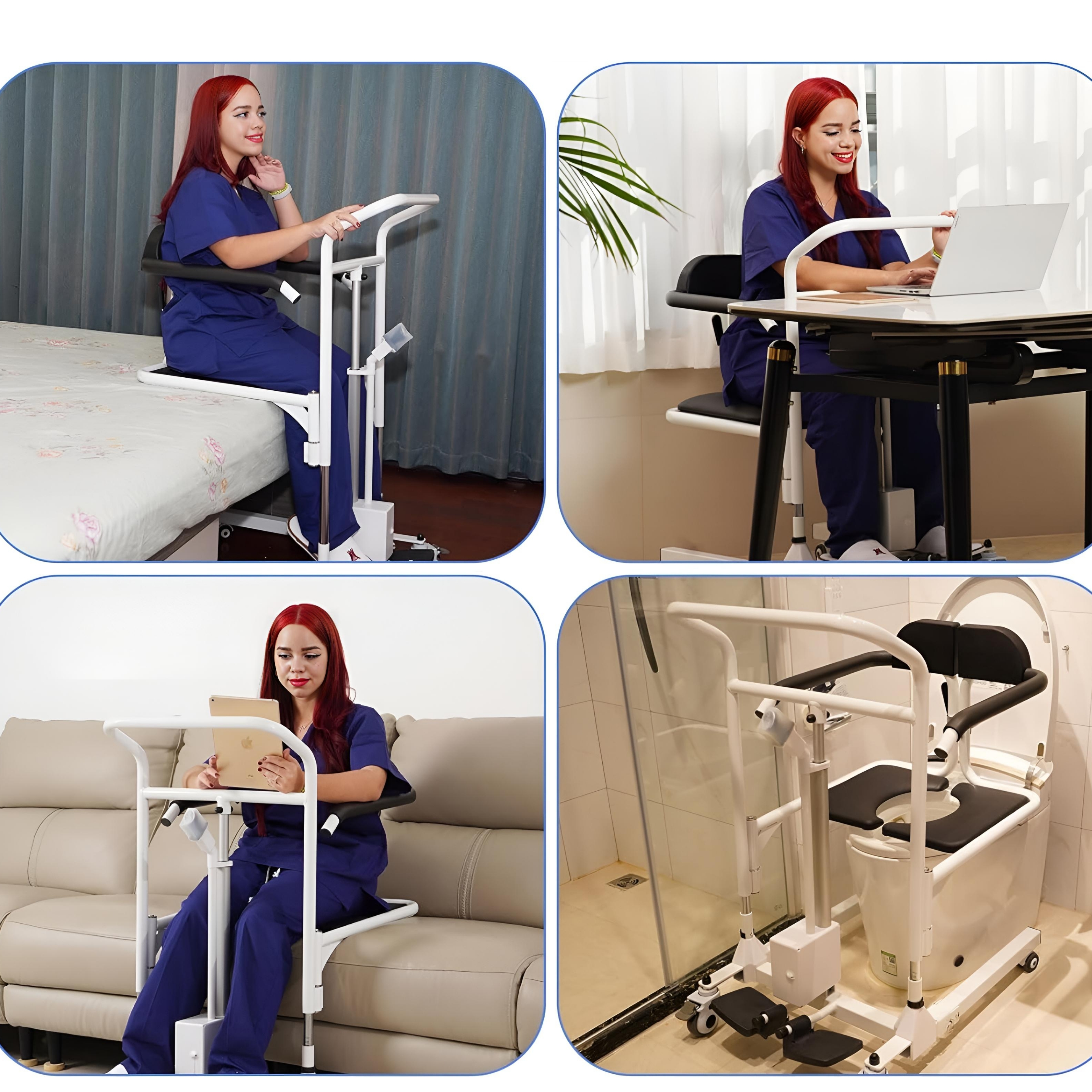 این صندلی با ریموت برقی ارتفاع رو تنظیم میکنه، بیمار روی آن مینشیند، و شما به راحتی میتوانید او را به تخت، سرویس بهداشتی یا هر مکان دیگری منتقل کنید؛ بدون فشار روی کمر مراقب و بدون استرس برای بیمار.