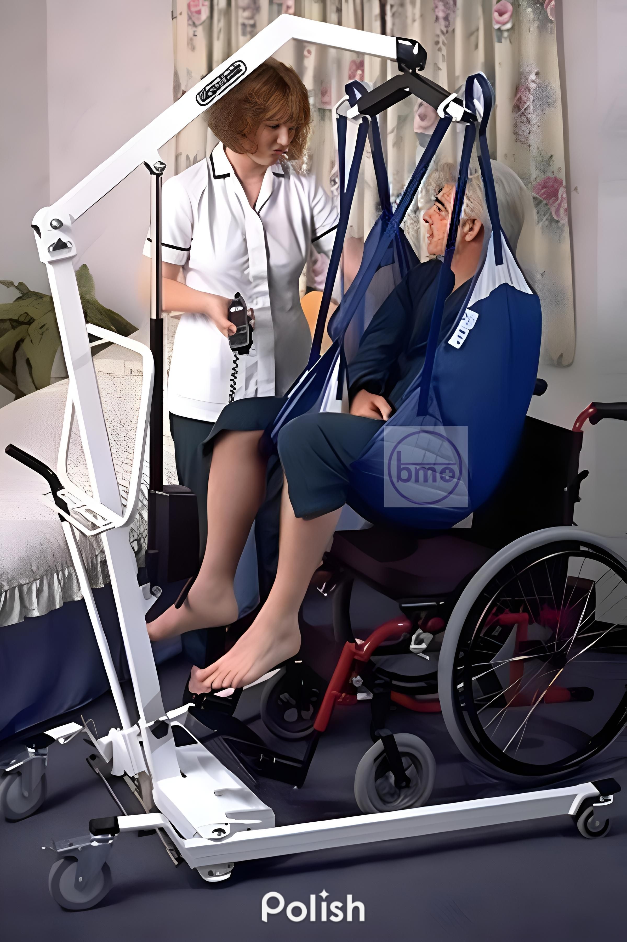 در حالت خانگی (Floor Lift)، از آن برای جابجایی بیمار از تخت به ویلچر یا صندلی و بالعکس استفاده میشود. مراقب با کنترل بیسیم، بازو را بهآرامی بالا برده و بیمار را در موقعیت دلخواه قرار میدهد.