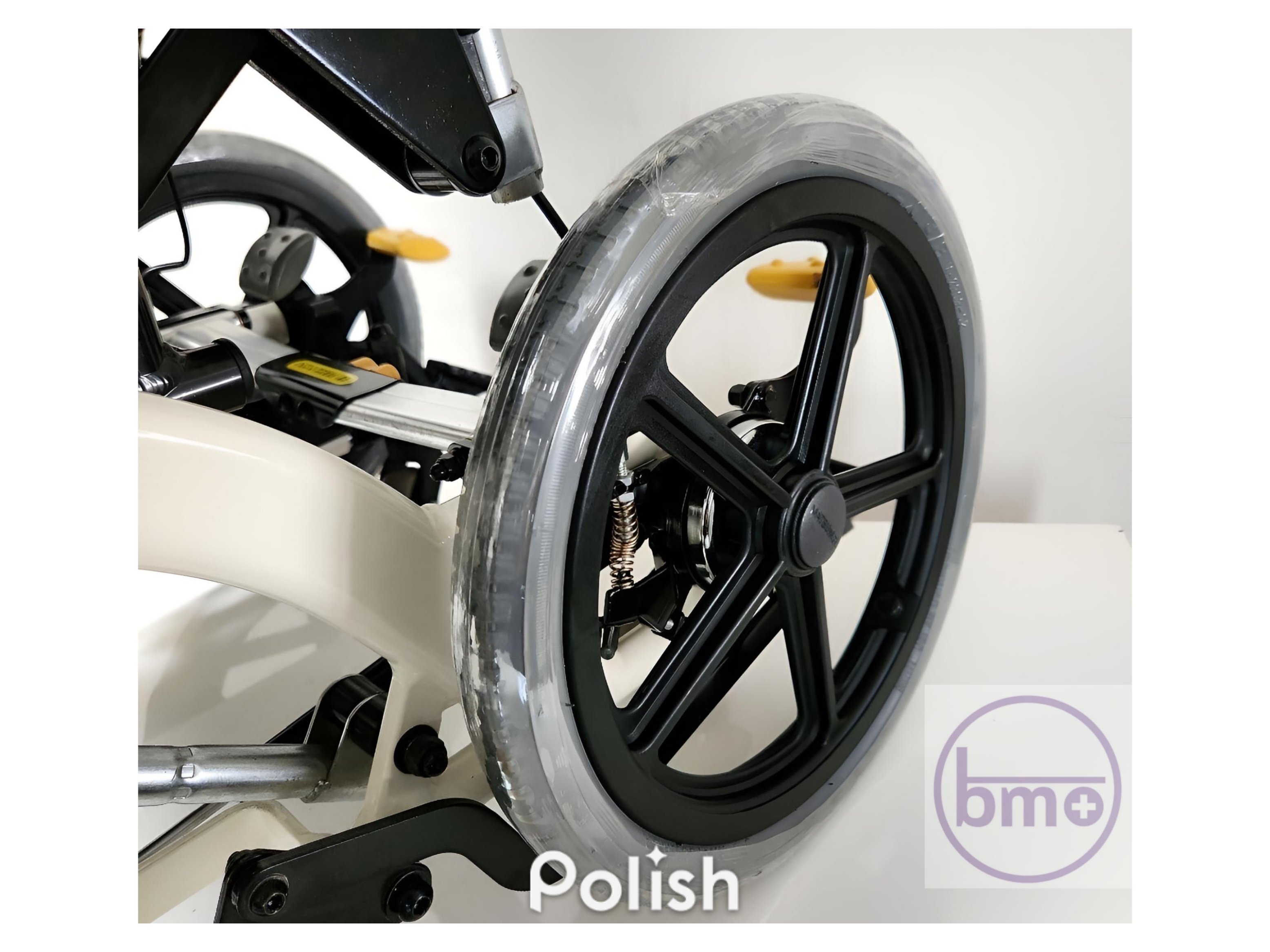 سیستم حرکتی ویلچر نیز کاملاً حرفهای است. چرخهای عقب از نوع بادی (پنوماتیک) با رینگ آلومینیومی و تایر ضخیم هستند تا حرکت نرم و بدون لرزش روی سطحهای مختلف فراهم شود.