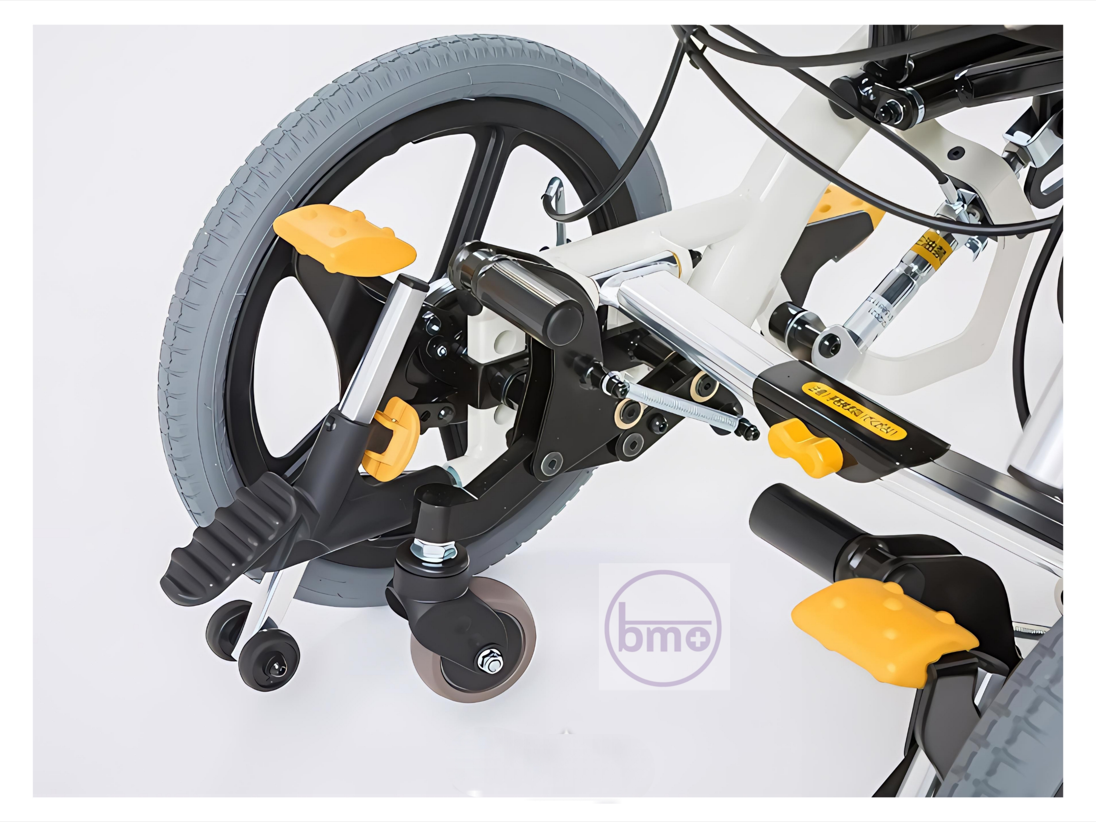 وقتی پدال فشرده میشه، نیرو از بازو به شاسی منتقل میشه و باعث میشه چرخ جلو بالا بره؛ یعنی ویلچر بهآرامی روی چرخهای عقب و چرخ کمکی زیرین متعادل میشه.