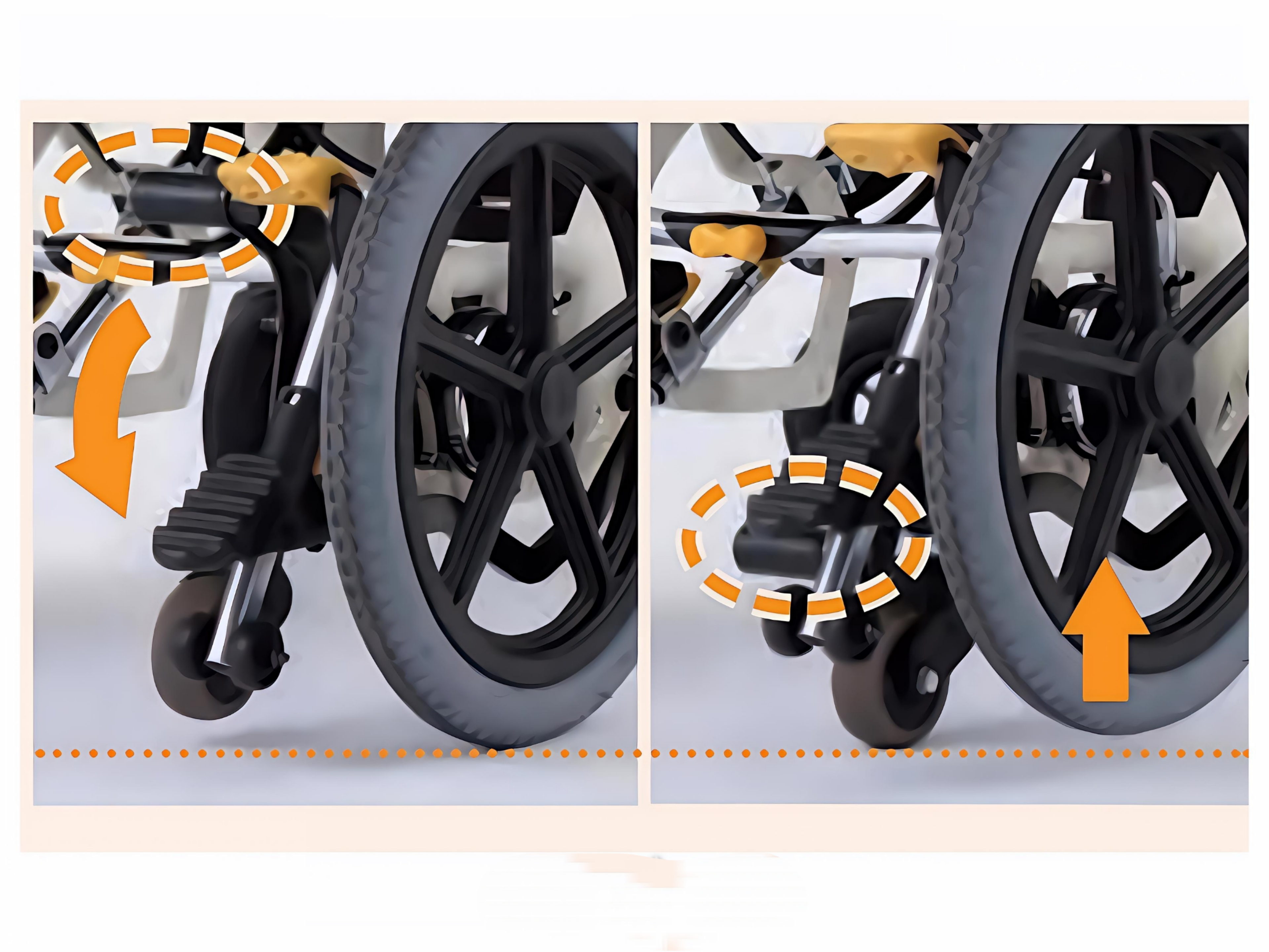 بعد از عبور از مانع، وقتی فشار پدال برداشته میشه، چرخ کمکی خودبهخود به حالت اولیه برمیگرده و از زمین جدا میشه.