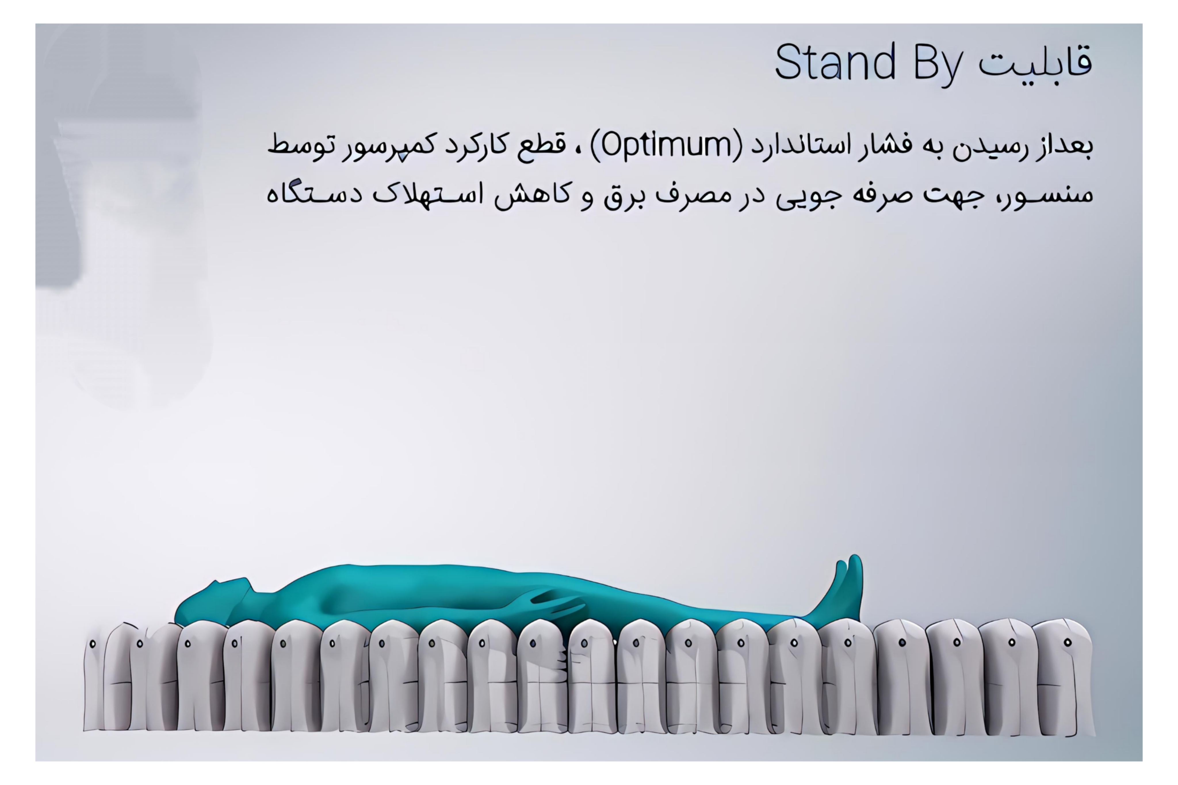 یکی از بزرگ ترین مزیت های این دستگاه قابلیت standby می باشد که پس از رسیدن فشار به سطح مورد نظر موتورها غیر فعال می شوند. این ویژگی سبب کاهش استهلاک دستگاه و کاهش مصرف برق بیمارستان میشود.