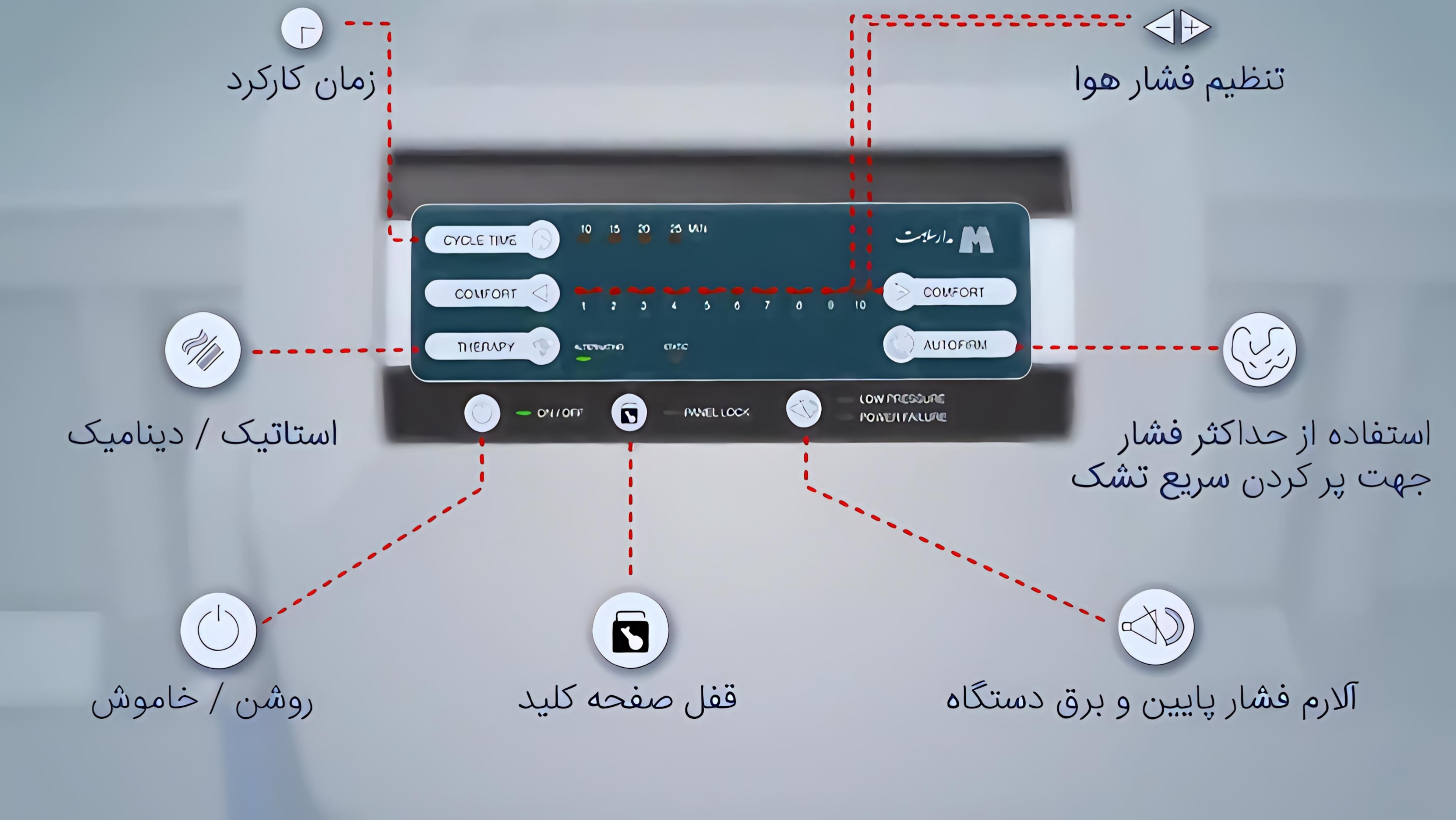 پمپ با کنترل دقیق فشار در این دو مدار، بهصورت متناوب با انتخاب مناسب هر چند دقیقه یکبار سلولها را پر و خالی میکند. این حرکت نرم و آرام، حس شناور بودن را برای بیمار ایجاد کرده و مانع از بیحسی یا گرفتگی عضلات میشود.
