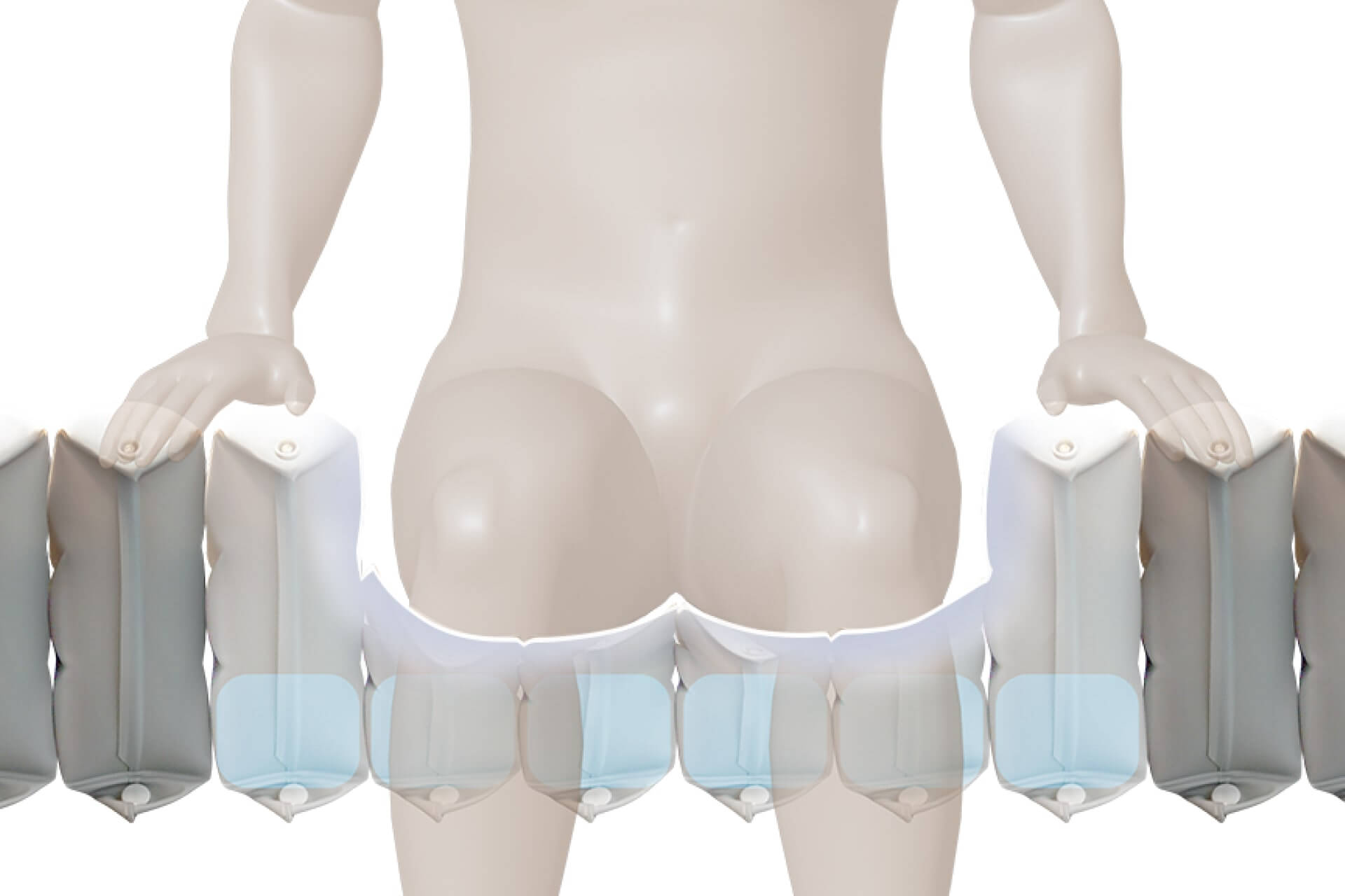 این مدل به کمک پمپ هوای هوشمند و سلولهای هوا با طراحی سلولی طولی، فشار وارده به بدن بیمار را در بازههای زمانی منظم تغییر میدهد تا جریان خون در سطح پوست و عضلات حفظ شود.