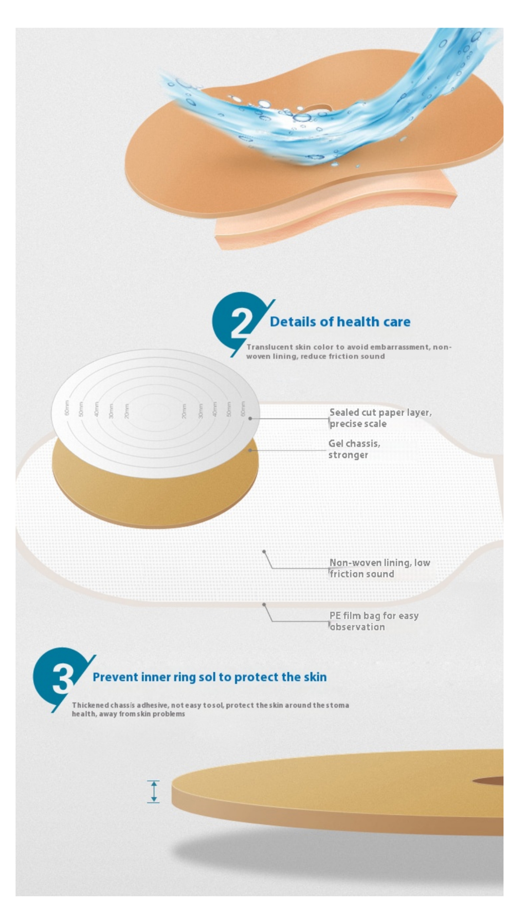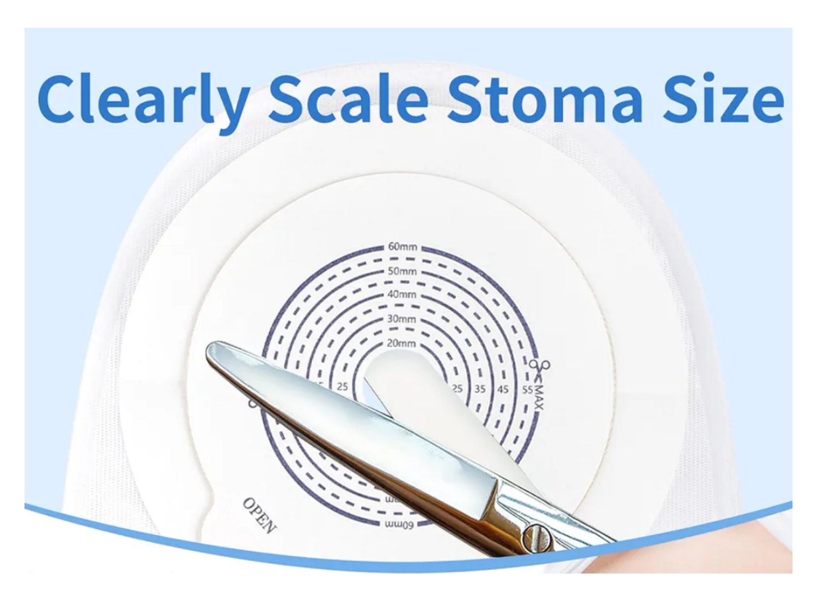 دهانه چسب قابل برش تا قطر 60 میلیمتر است تا برای انواع اندازههای استوما قابل تنظیم باشد.