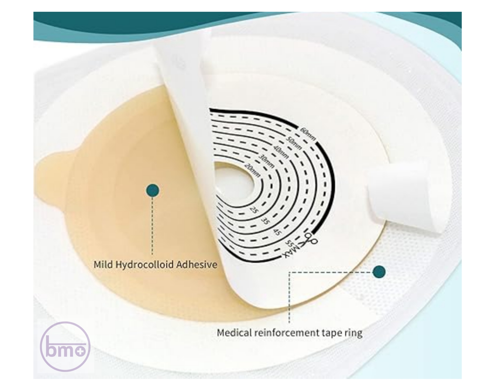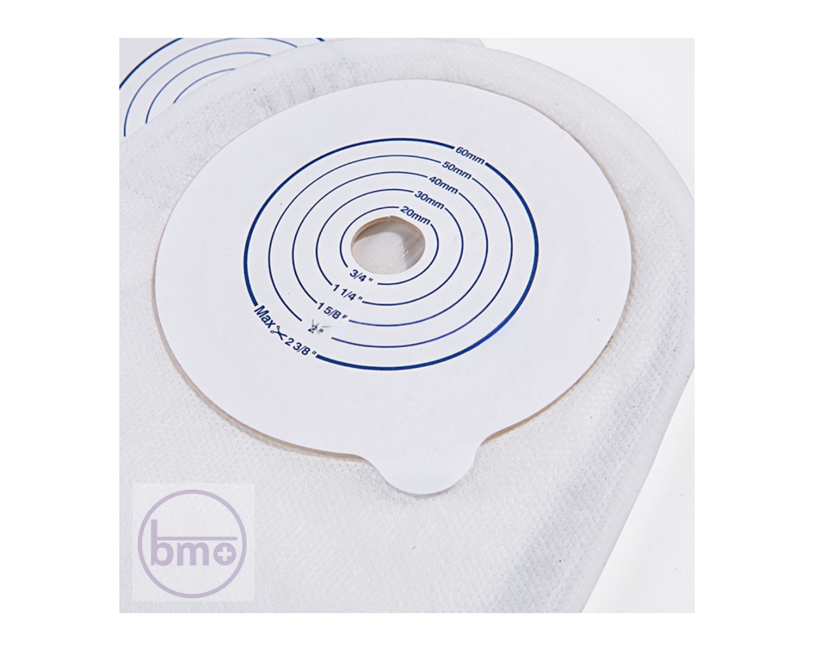 دهانه چسب قابل برش تا قطر 60 میلیمتر است تا برای انواع اندازههای استوما قابل تنظیم باشد.