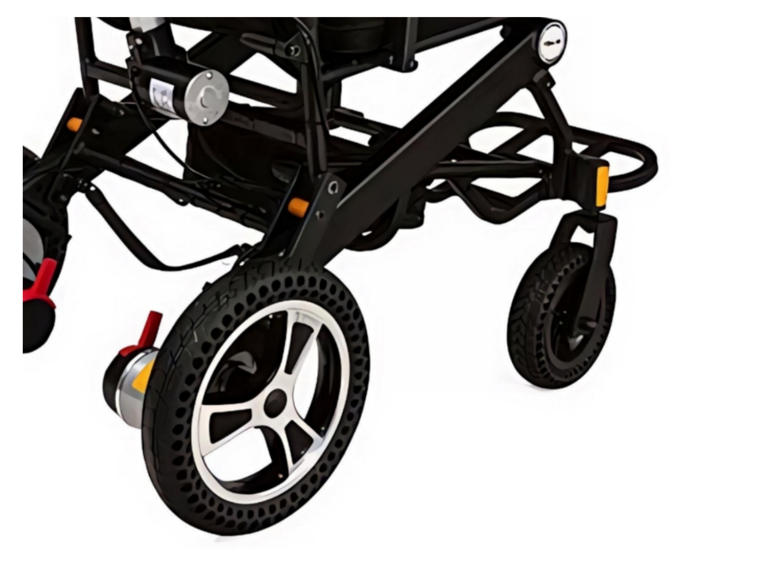 چرخهای ویلچر از نوع توپر بدونپنچری هستند. چرخهای عقب بزرگ و دارای ساختار سلولی هستند که بخشی از ضربات مسیر را جذب میکنند و چرخهای جلو نیز کوچکتر اما بسیار رواناند که باعث میشوند ویلچر بهراحتی در محیطهای کوچک مثل خانه، آسانسور و سرویس بهداشتی بچرخد.