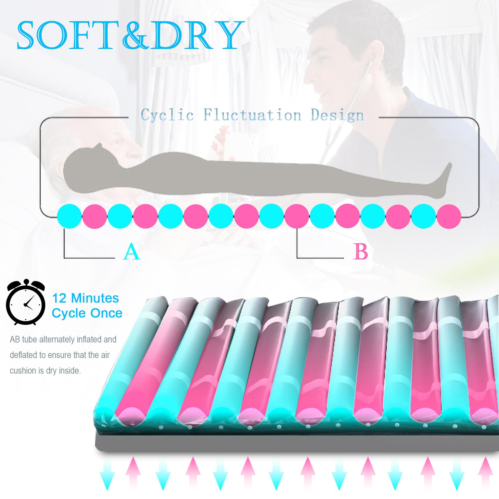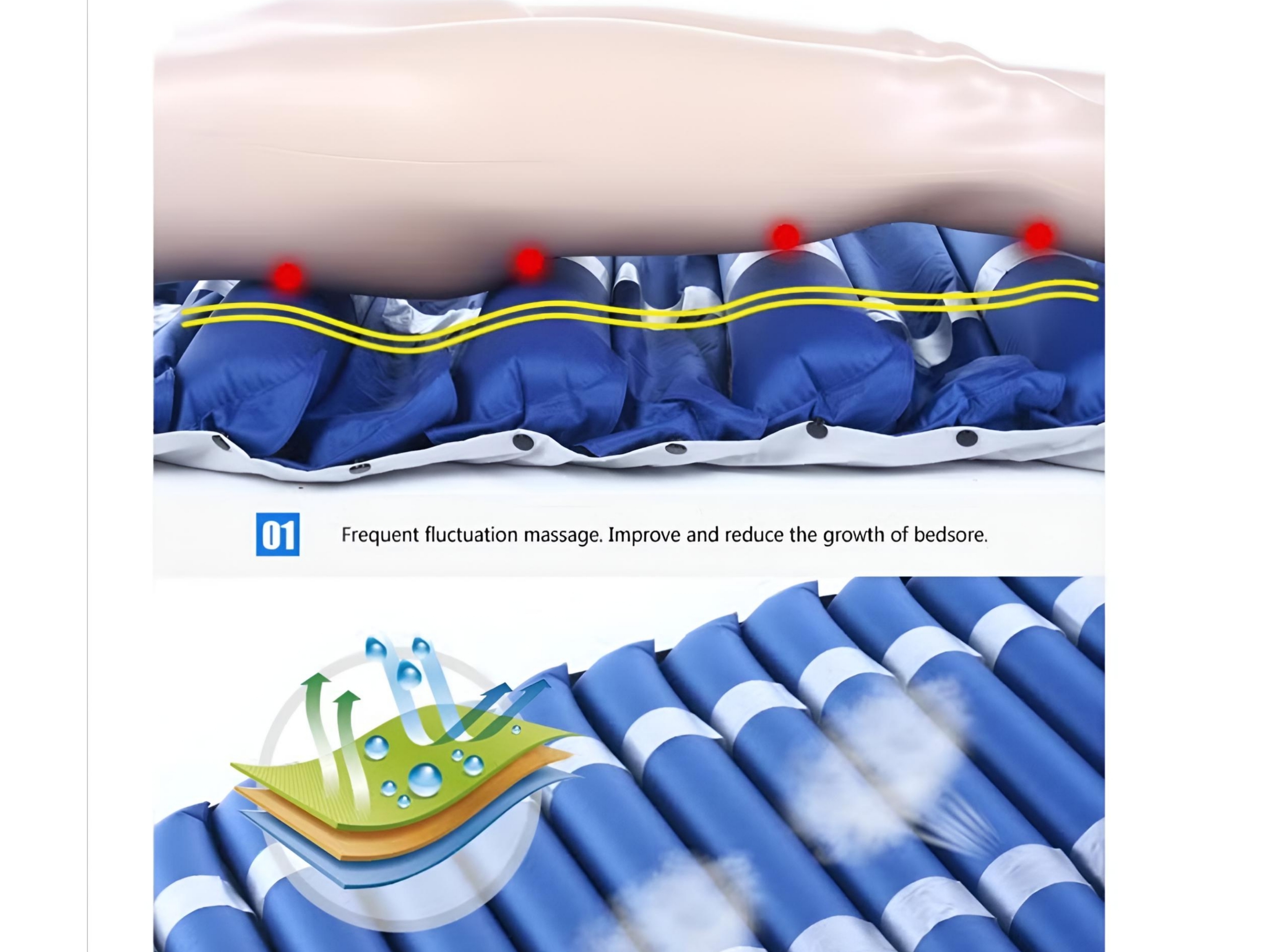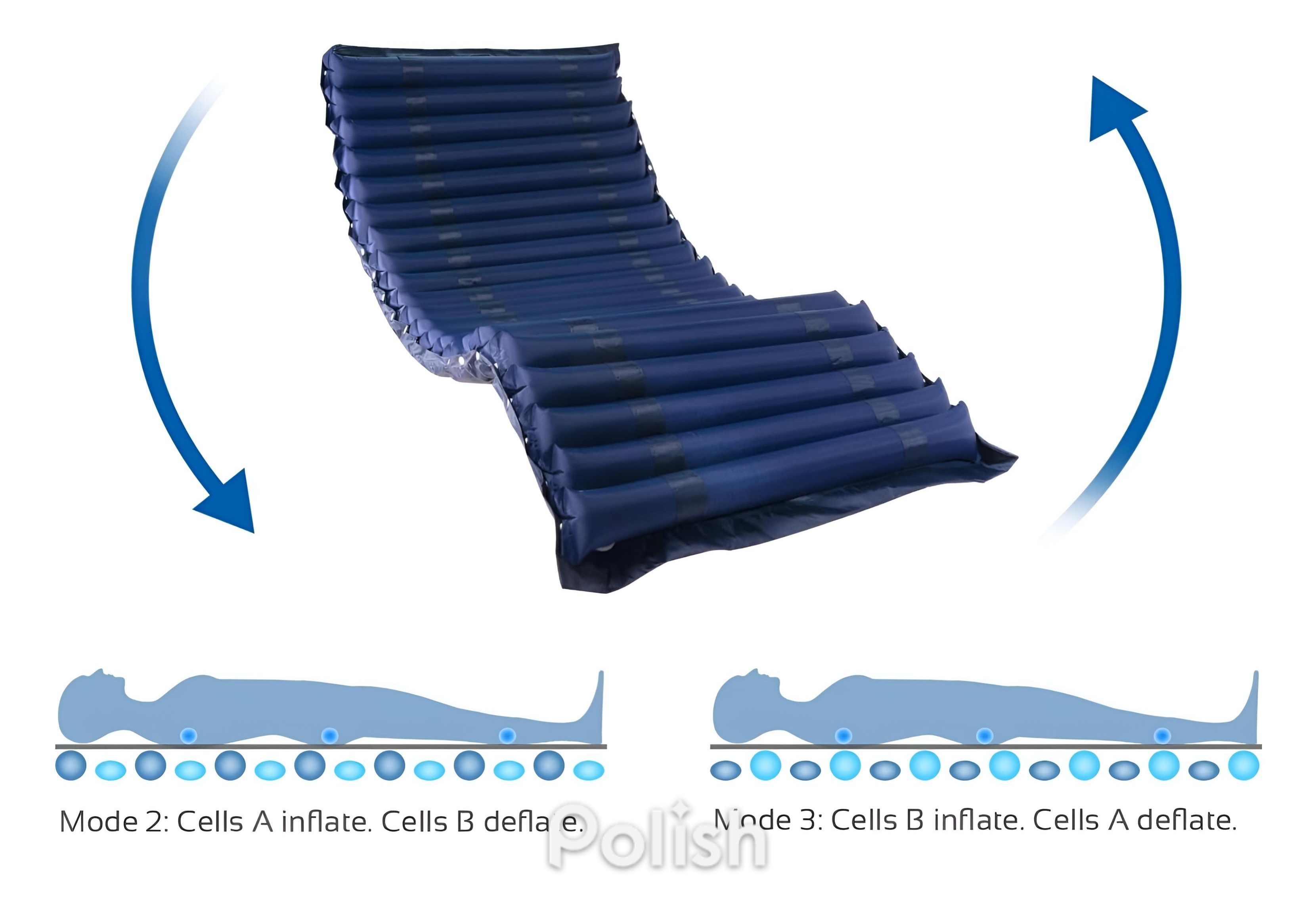 این محصول با بهرهگیری از سیستم **گردش هوای متناوب در سلولهای بادی**، فشار وارد شده به بدن بیمار را به صورت مداوم تغییر میدهد و از متمرکز شدن فشار در نقاط حساس بدن جلوگیری میکند.