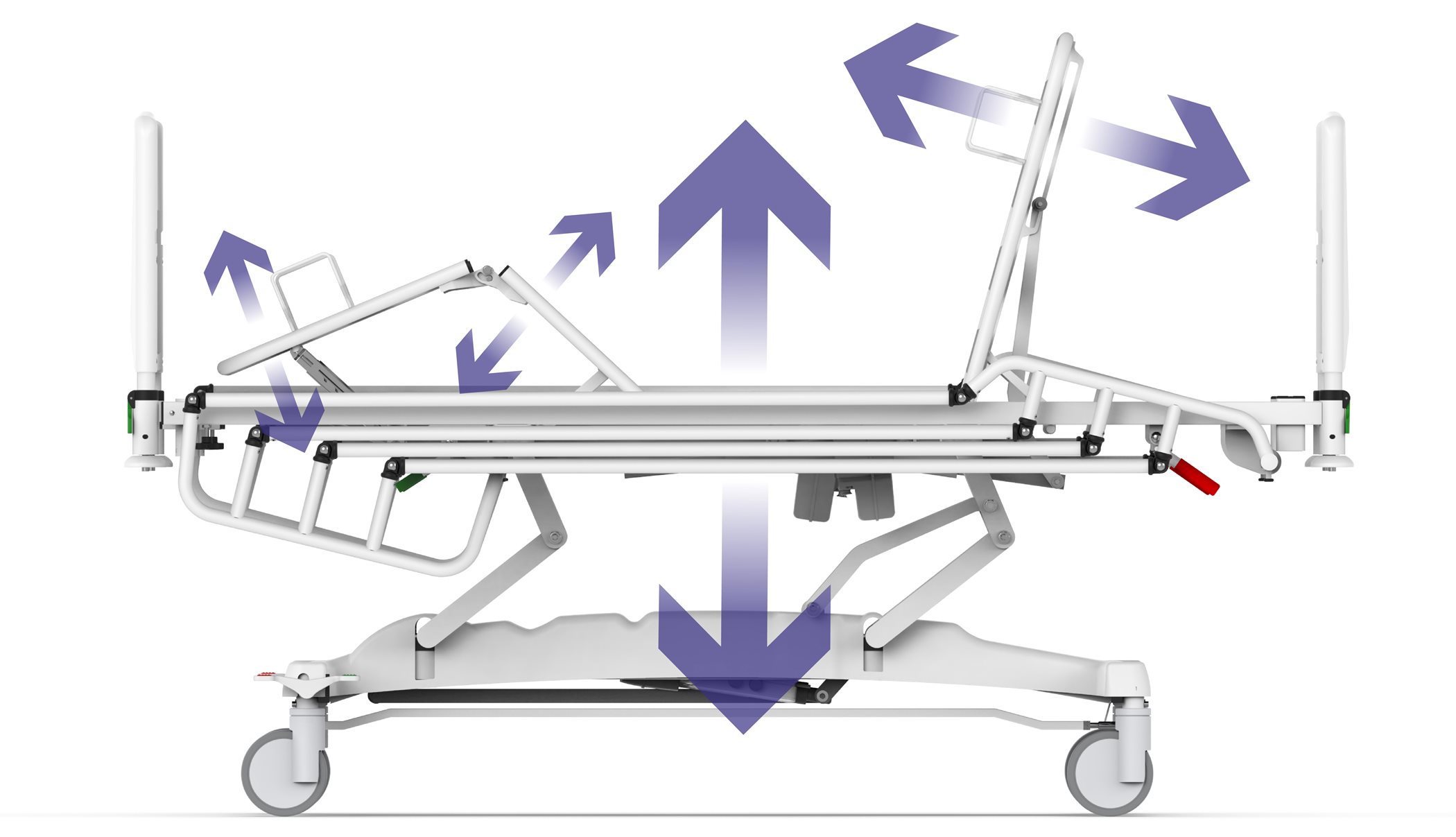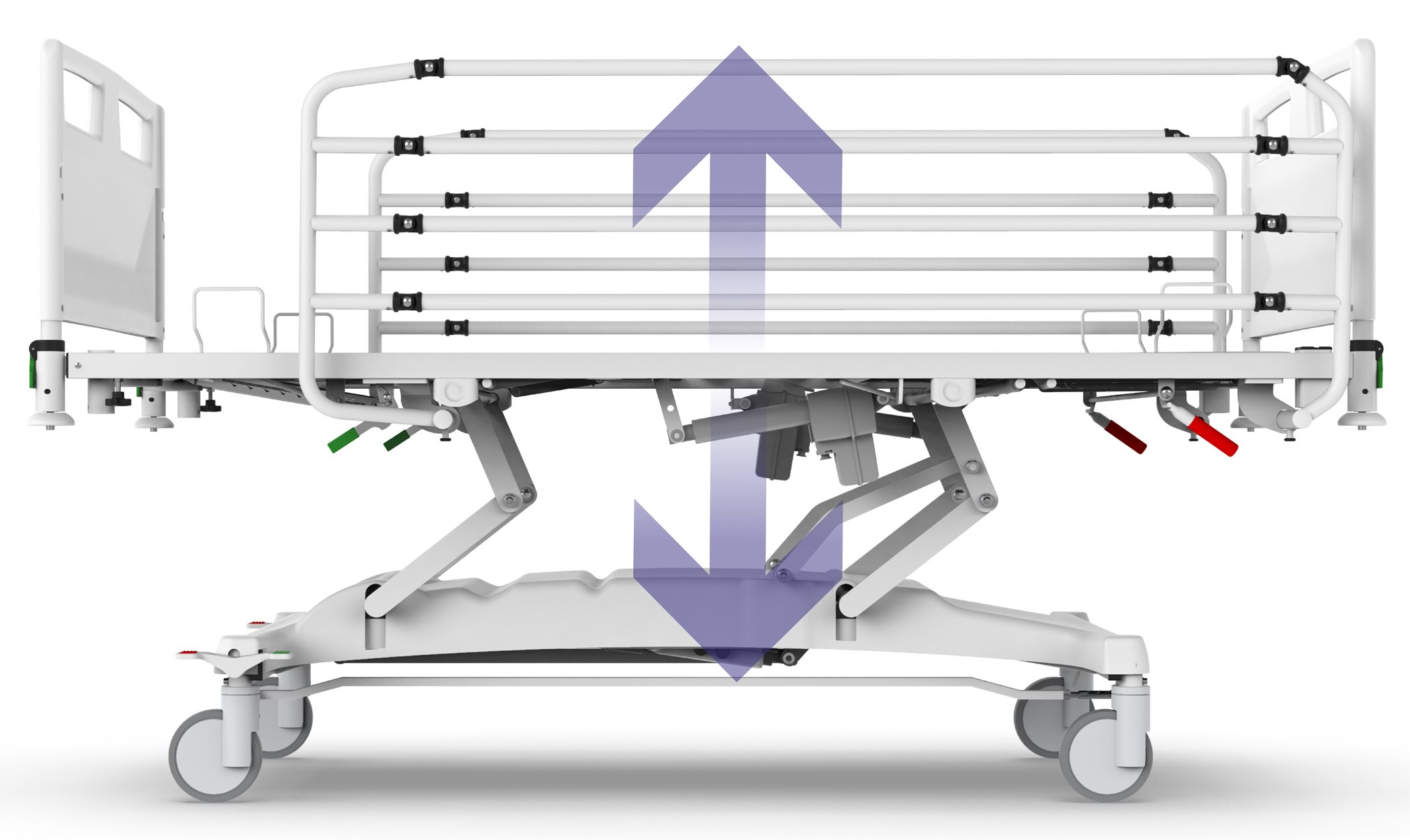 3. **موتور تنظیم ارتفاع (Hi-Low):** با قابلیت تغییر ارتفاع از ۴۵ تا ۷۵ سانتیمتر، که عنصری حیاتی در کاهش ریسک کمردردهای مزمن در پرستاران و مراقبین بوده و انتقال بیمار به ویلچر یا برانکارد را ایمنتر میکند.