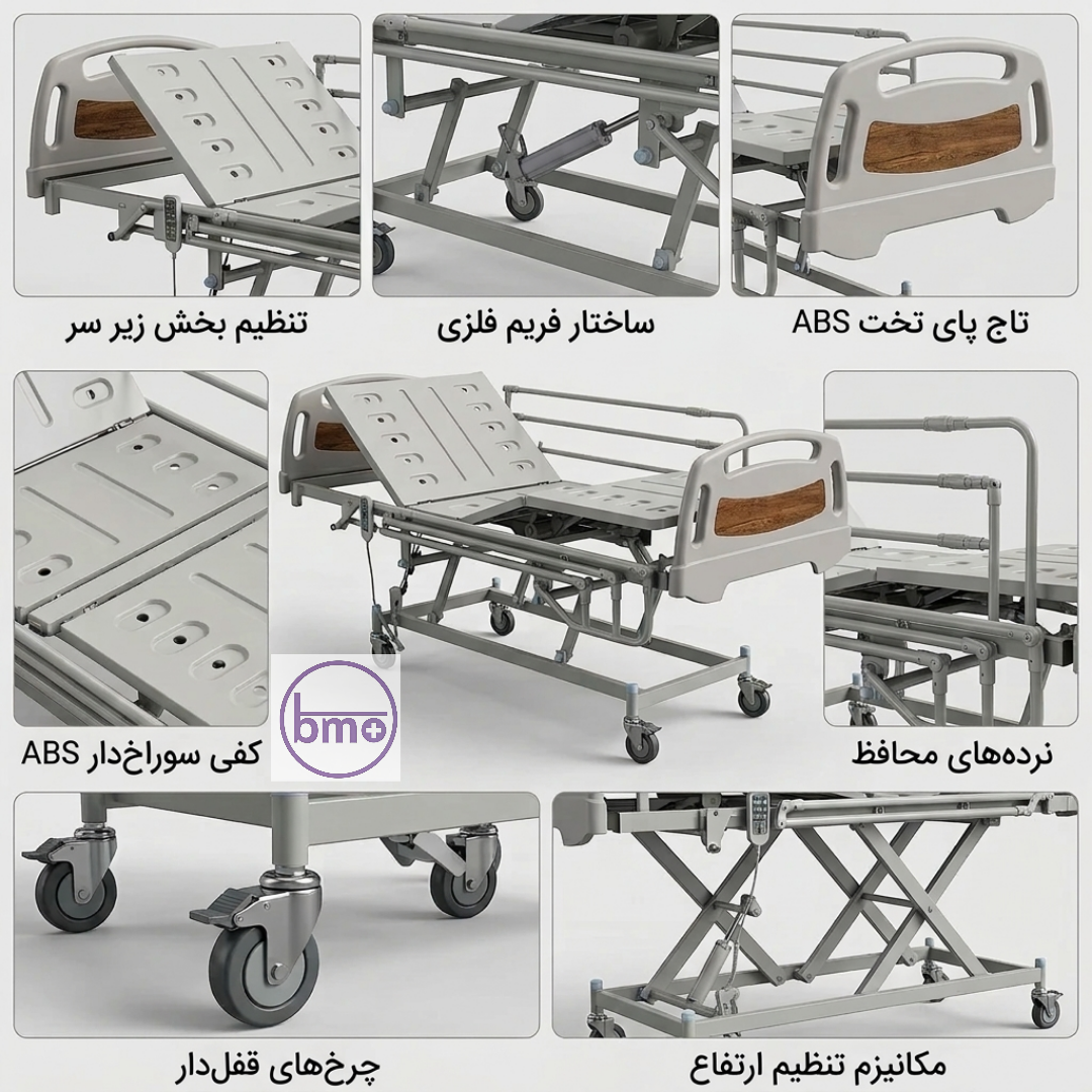 تخت برقی ۳ موتوره، 4تیکه مدل ABS با بدساید آکاردئونی**، یکی از کاملترین و استانداردترین تختهای مراقبتی ویژه بیمار محسوب میشود.