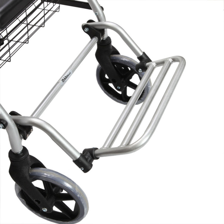 -رولیتور 4 چرخ آلومینیوم -دارای صندلی نشیمن -دارای جای پا -دارای سبد -دارای ترمز روی دسته ها و قفل چرخ ها -دسته قابل تنظیم ارتفاع از 78cm تا 90cm -تحمل وزن 110kg -ساخت چین